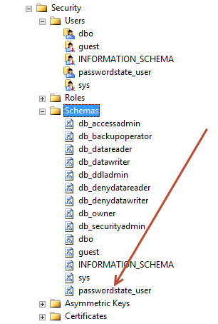 - If you receive an error message similar to 'The database principal owns a schema in the database, and cannot be dropped', then expand the 'Schemas' tree node and delete the 'passwordstate_user' schema