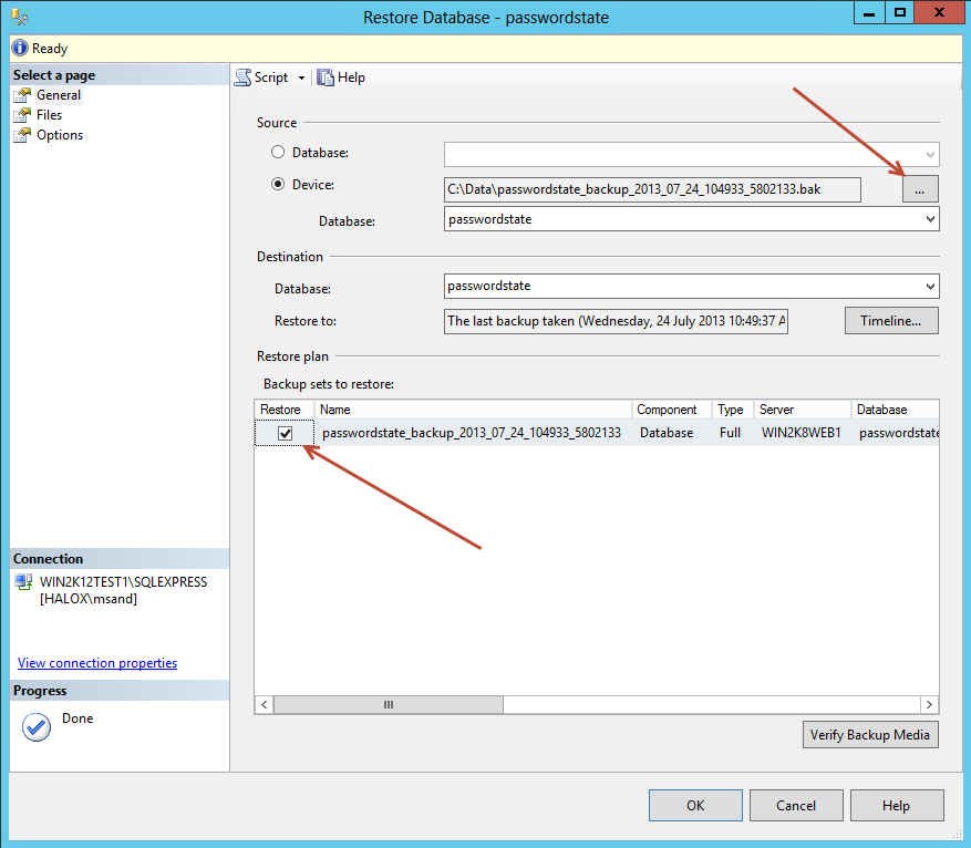 - Click on the 'Device' eclipse and browse and select your saved database backup, and click the 'Restore' checkbox under the section 'Select the backup set to restore'