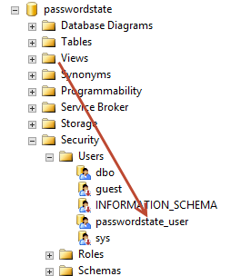 - Navigate to Databases -> passwordstate -> Security, and delete the account passwordstate_user