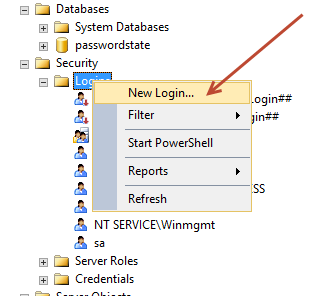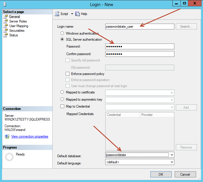 - Create a new SQL Account account called passwordstate_user, setting the password to the value in your database connection string in your web.config file (located in the root of the Passwordstate folder), set Default database to passwordstate