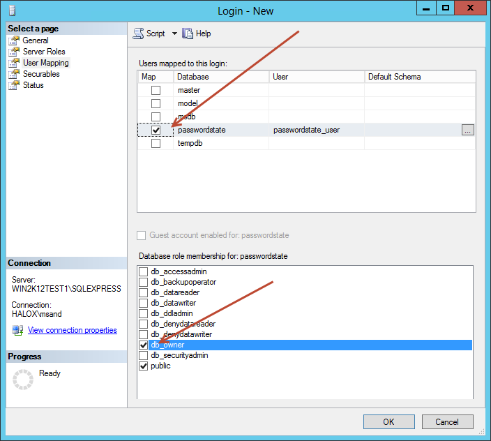 - Grant db_owner rights to the passwordstate database under the User Mapping page