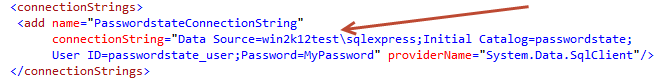 - Now you need to edit the Data Source value in the web.config file for the PasswordstateConnectionString - this value needs to be the host name of your new database server. Note: if your SQL Server is installed with a named instance, then the formatting of the host name should be HostName\SQLInstance